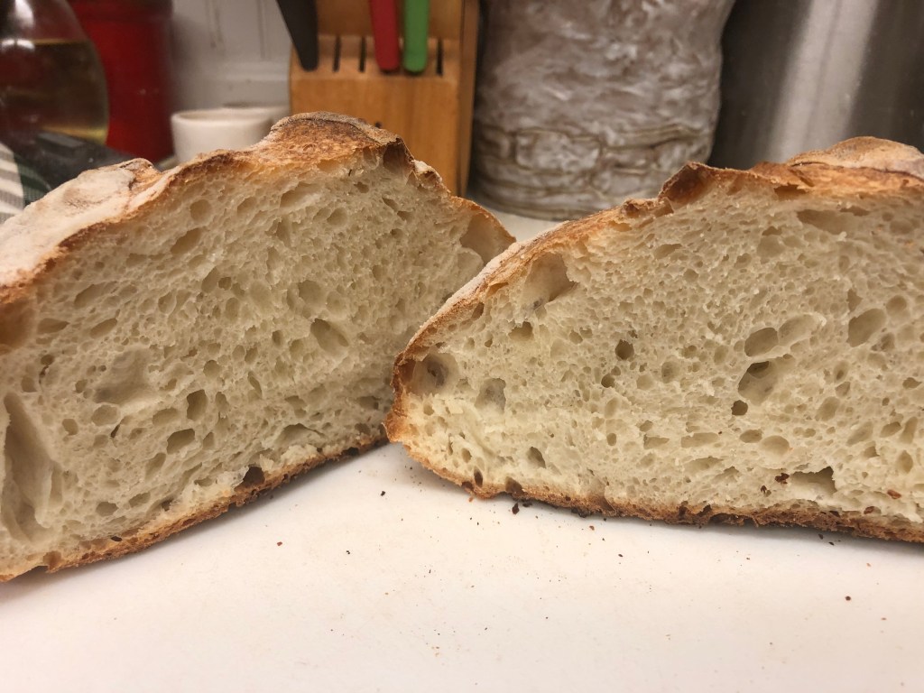For the second loaf, return the Dutch oven (or bowl) to the oven for at least 15 minutes. When sufficiently hot, add the second dough (keep refrigerated until it’s time). Bake as with the first.