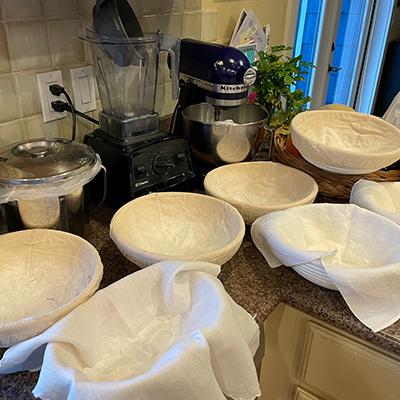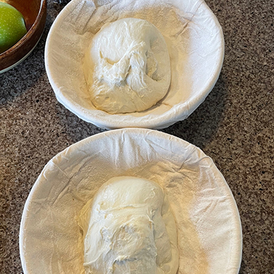 10:40 am Flour two baskets liberally with rice flour (coat well). Gently stretch dough lengthwise. Then stretch dough from the side over 1/3 of the loaf. Repeat on other side. Then fold over from the top and then again from the bottom. Gently drop into basket, seam side up. Repeat with second loaf. Cover with a plastic bag and refrigerate for 2-4 hours.