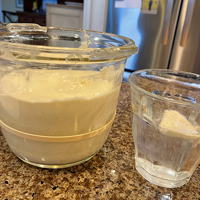 In the morning, repeat the feeding you did the night before. (113/113/113). [Note: on Bread Day, I feed my starter between 7-8 a.m. and mix my bread 12-4 pm, but feel free to adjust the timing to your schedule. The important thing is that you mix your bread dough when your starter is active. This happens when it’s doubled in size and when a small spoonful of dough in a glass of water floats (usually 3-6 hours after feeding). Don’t wait too long after it’s doubled; if the dough begins to collapse, it won’t be as optimal.