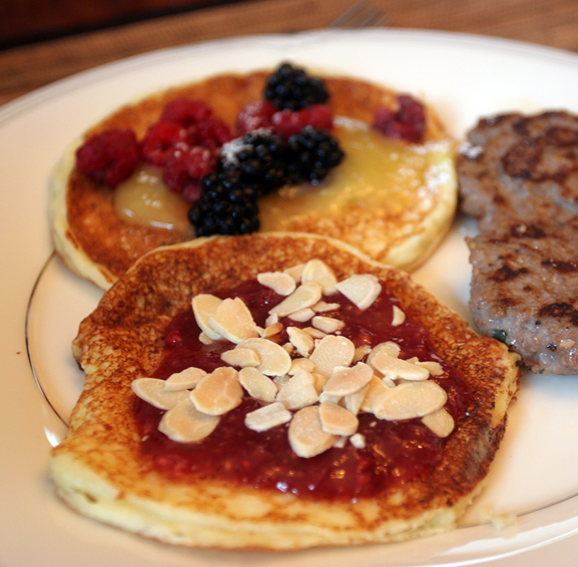 Pour the batter into a spouted measuring cup (you may have to do this in a few batches depending upon the size of your cup) and carefully pour the pancakes (in any size or shape that appeals to you) onto the griddle. When the edges start to get dry, it’s ready to flip. (This should only take a minute or so). Most griddles have “hot spots” so pay attention to that and move around the pancakes until done to your satisfaction!