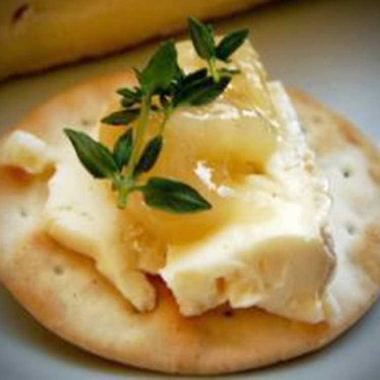 Lay out the crackers on trays. Cut the brie into pieces that fit on each cracker. Put a teaspoon of lemon curd on each appetizer as pictured. Lay a small sprig of thyme on the top of each and serve.