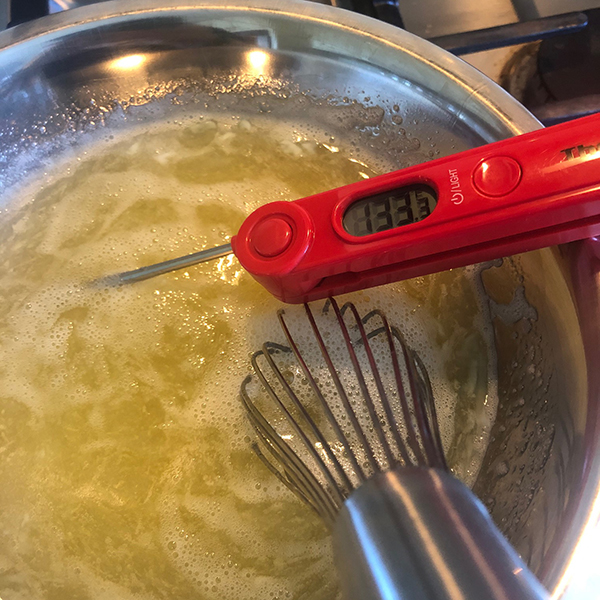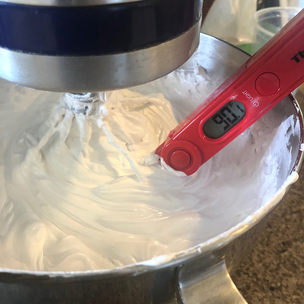 Once you’ve reached your safe temperature, add the mixture to the bowl of your stand mixer (or use a large bowl with a handheld mixer). Whisk on medium speed for about ten minutes until the mixture has cooled to 90°F. The outside of the bowl should be cool to the touch and the mixture should look thick and glossy.