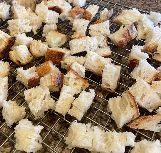 One large loaf of your favorite crusty bread (10 cups, diced into 1 inch square cubes)