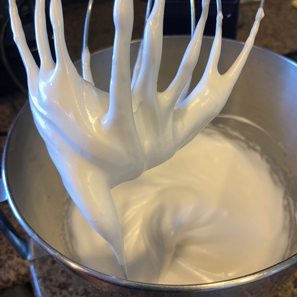 Continue to whip on medium speed until the meringue reaches medium stiff peaks. Here’s what you want it to look like: