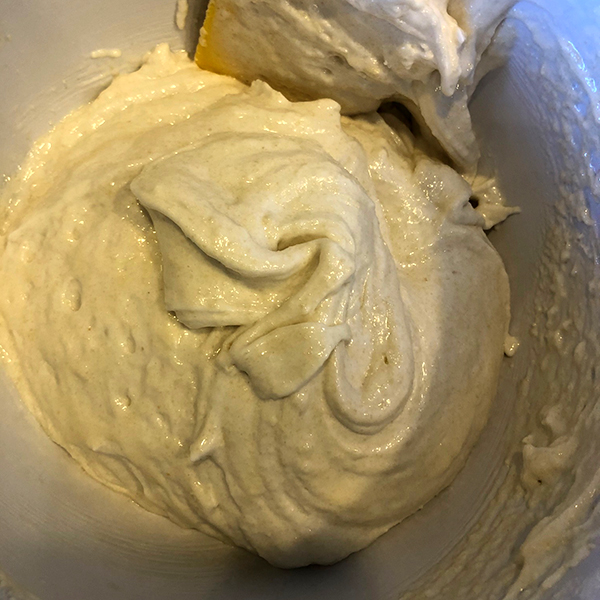 To know that you’ve mixed it right, lift a spoonful of batter and draw a squiggle with it atop the remaining batter and wait 12-15 seconds. If your squiggle softens around the edges, you know you have it right. Another way to know: if it’s too thick, it won’t fall easily off your spoon. You want it to run but slowly. It will also be a glossy batter.