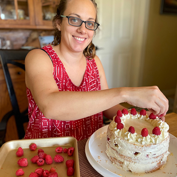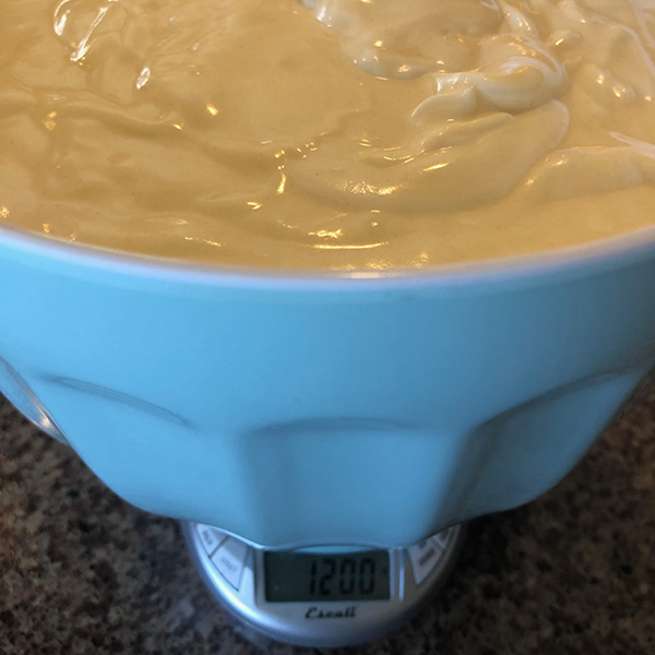 Place your (now empty) mixing bowl on your scale and zero it out. Spoon the fluffy cake batter into it and note the weight. Divide that weight in two. Example: 1200 grams total / 2 = 600 grams per cake pan. Scoop 600 grams into the first (prepared) cake pan until the scale reads 600. Pour the remaining batter into the second cake pan. Gently spread the batter so the top is more or less even.