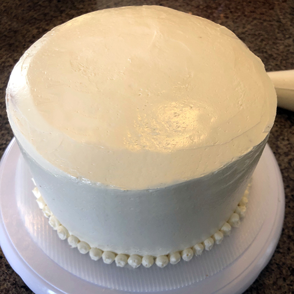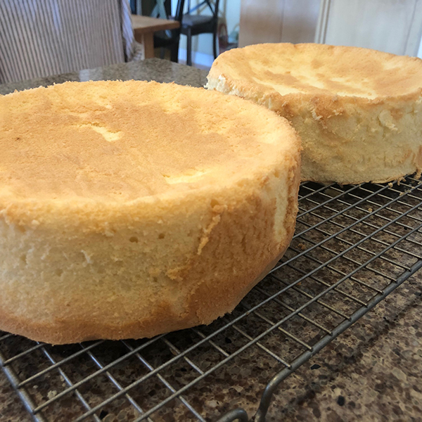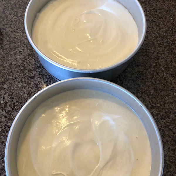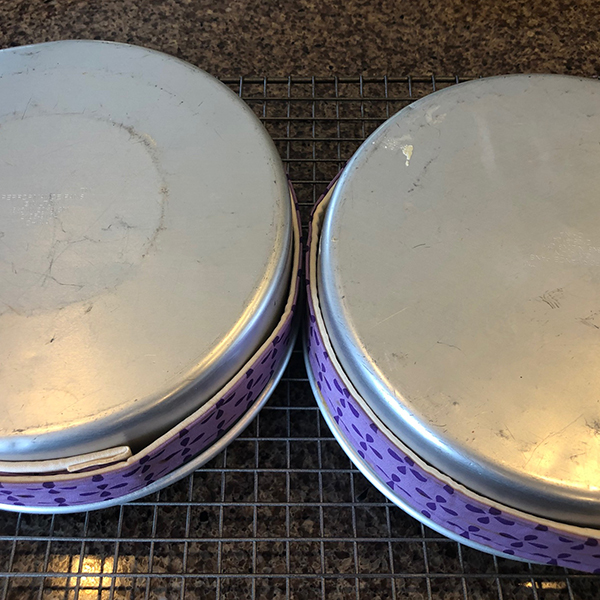Preheat oven to 350°F. Prep two 8” cake pans with spray (bottom only) and circles of parchment that fit the bottom. If you have cake collars, soak them in water for five minutes, squeeze out the excess water, and wrap them around the cake pans. (Optional, but see baking time adjustments below if using).