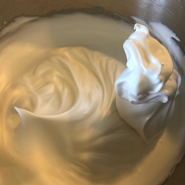 Thoroughly wash and dry the mixing bowl and add the whip attachment. On medium speed, whip the egg whites until foamy and slowly add cream of tartar and sugar. Turn mixer to medium high and continue whipping to firm peaks.