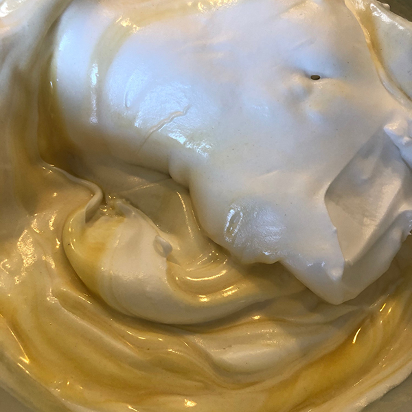 Fold a large spoonful of the egg white mixture (meringue) into the batter mixture and “lighten” the batter with this. Add the rest of the meringue and gently fold until fully incorporated.