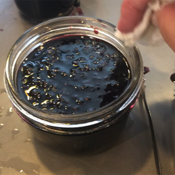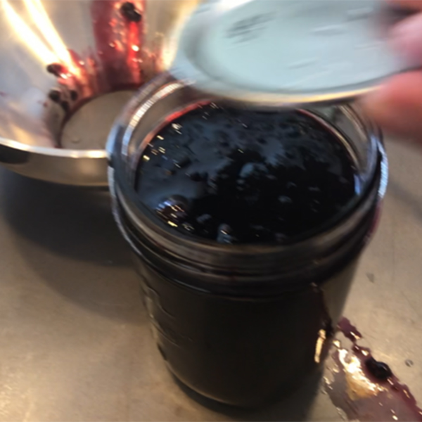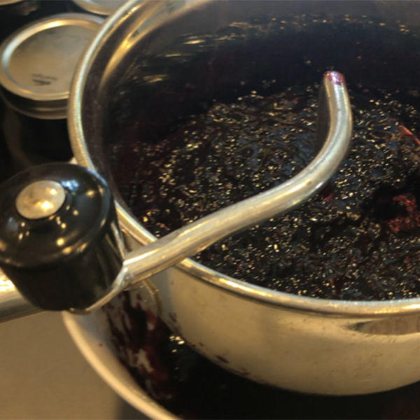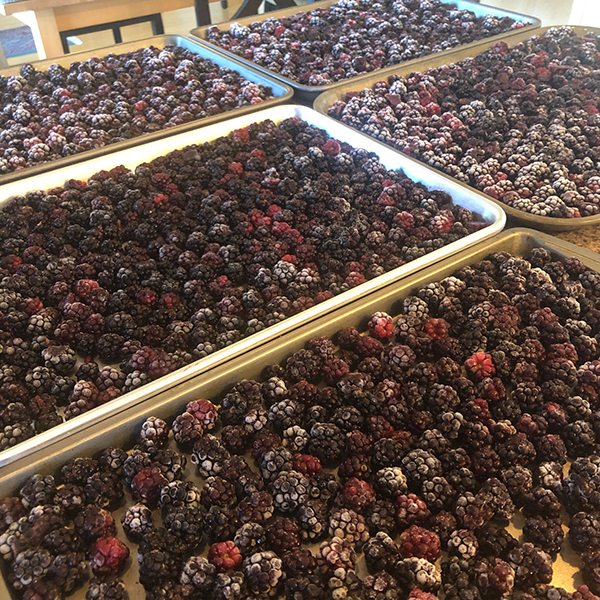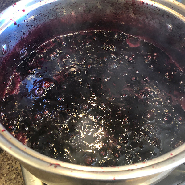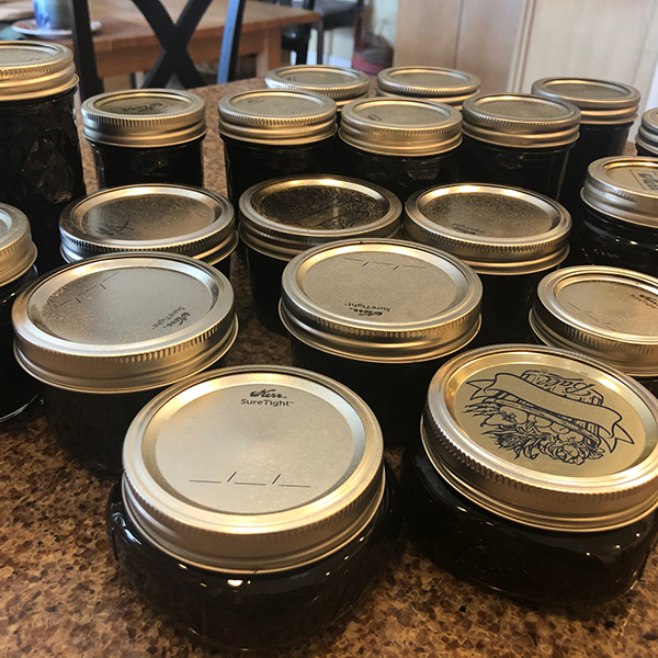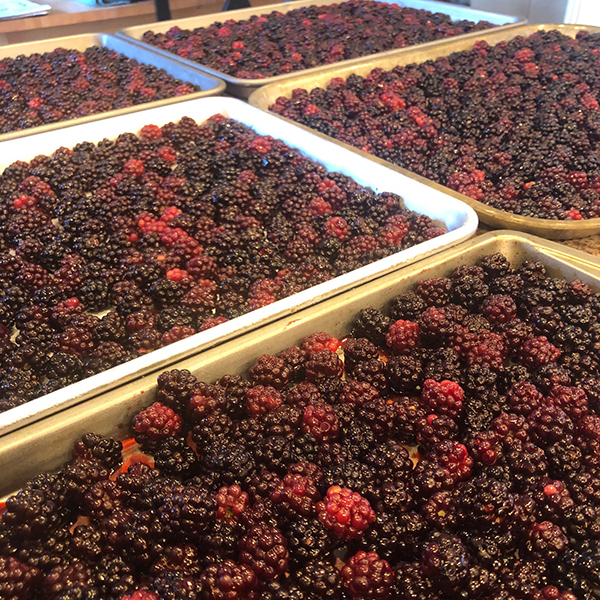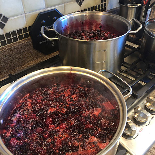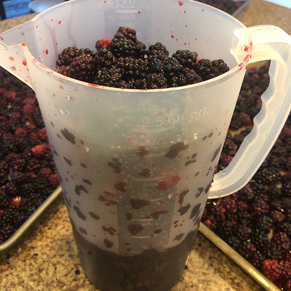 When blackberries are ripening on the vine in late August, I bring containers with me on my daily walks, often getting a quart or so at a gathering. Back in my kitchen, I lay them on parchment paper on a small sheet pan and pop them in the freezer for several hours. Once frozen, it’s easy to pick off the silly things that tend to stick to the fruit that you might not notice when picking. A full sheet pan does an admirable job of filling a one gallon Ziploc bag. I return these to the freezer until Jammin’ Day and then spread them out again to thaw.