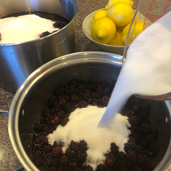 If you have a juice pitcher, they can be very useful as a measuring cup. The pitcher below holds 10 cups of blackberries (2.5 quarts). Whatever quantity you’re making, put the berries into a pot, and add the sugar on top.