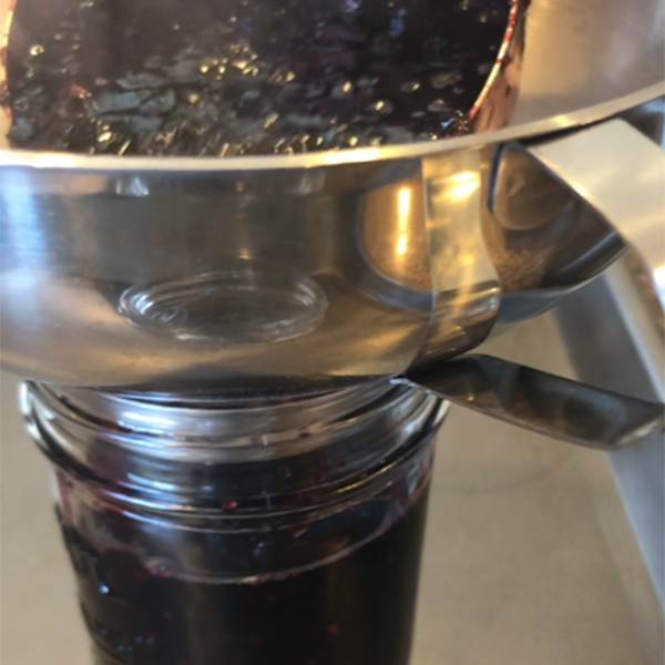 When you’re ready to fill your jam jars, use the jar lifter to lift them onto a clean counter, no more than one or two at a time. Use the canning funnel and ladle jam in 1/4″ from the top. Take a clean, damp paper towel and wipe any drippings off the rim. This is important! You want to make sure the seal is tight to prevent bacteria down the line.