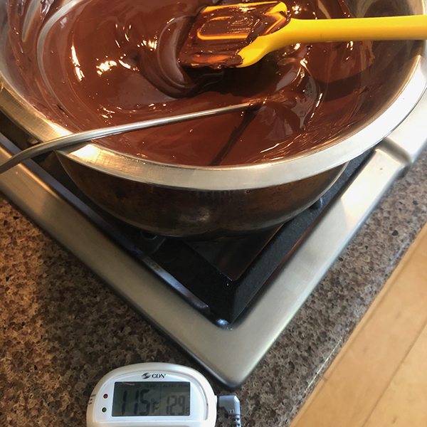 Put your probe thermometer in the chocolate bowl. When the temperature reaches 46°C/115°F, lift the pot off the heat, wipe the bottom of the pot with a dishtowel and place it on a folded dishtowel or potholder on the counter. Doing this will help it not cool too quickly when it comes in contact with a cold counter.