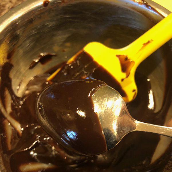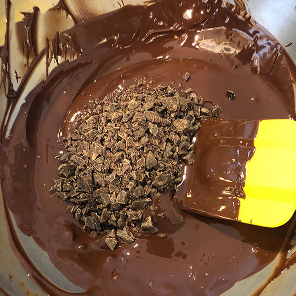 Finely chop the chocolate and place four-fifths (80%) of it in the top of a bain marie (double boiler) without letting the chocolate bowl touch the water. Set the other fifth (20%) of the chocolate aside. In the bottom pot of the bain marie, put about an inch of water and turn your burner to simmer. You’re going for a gentle heat here. Stir every few minutes until fully melted.