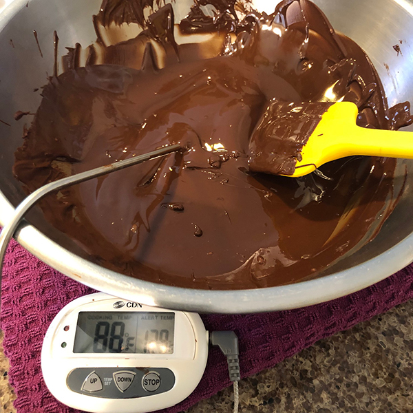 Temperature is all-important when tempering. Invest in a reliable probe thermometer (They don’t have to be expensive; I got mine at a high end kitchen store for $8.99) and watch it carefully when you’re tempering. Shut off your phone. Remove all distractions. Feed the dog and fill the bird feeder ahead of time. If you learn nothing else from me on this, learn that!