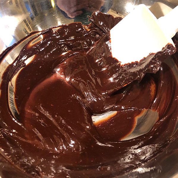 Chocolate is absolutely ruined if it comes in direct contact with even the tiniest drop of water (it will have a dramatic seizure…hard to recover from). Keep your work stations dry. Have a dishtowel ready to wipe the condensation off the bottom of the bowl when it comes off the bain marie. Check that the tools you are using are completely dry as well. If you get your hands chocolate-y and wash them, dry them completely afterward.