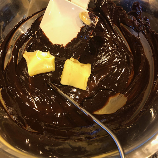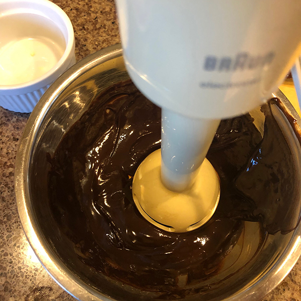 In a small saucepan, heat the heavy cream/milk mixture to scalding and immediately turn off the heat. Pour the heavy cream over the top of the chocolate and let it sit for a few moments before stirring. Once the chocolate has melted and been stirred, add the room temperature butter and blend the ganache (immersion blenders are great for this, but a hand mixer will do as well).
