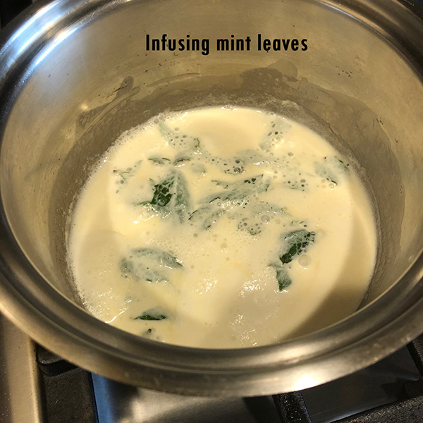 8-10 hours ahead, add spices or herbs to the cream mixture. Once the solids are strained out of the cream, you can heat a cold infusion to make a ganache (see below) or ice cream base, etc., without losing the fresh, bright flavor obtained from the cold infusion.