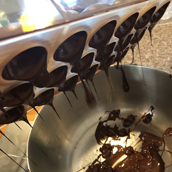 Once the chocolate temperature reaches the sweet spot of 32°/90°, it’s time to pour the melted chocolate into your mold.