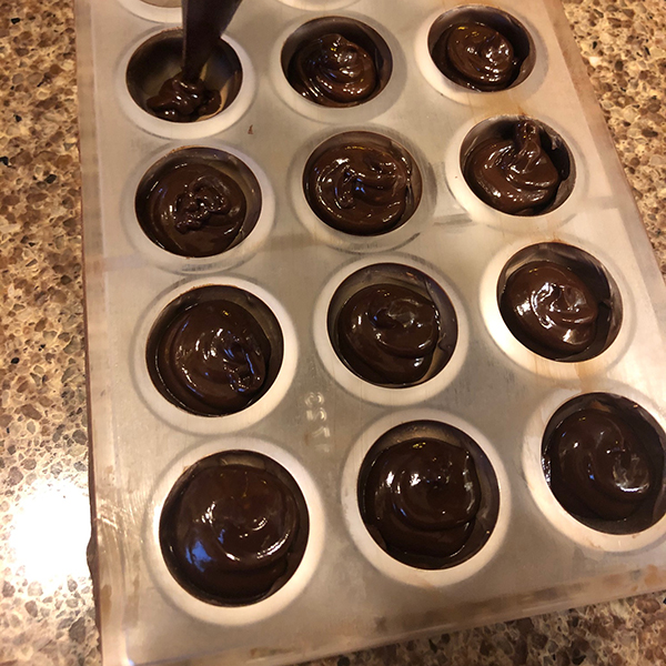Pipe the chocolate ganache into the tempered chocolate molds, leaving a 1/8″ space from the top. Once piped, cover the molds with plastic wrap and set it in a cool room (ideally around 65°F) overnight or refrigerate for an hour (don’t leave in fridge or it will collect moisture).