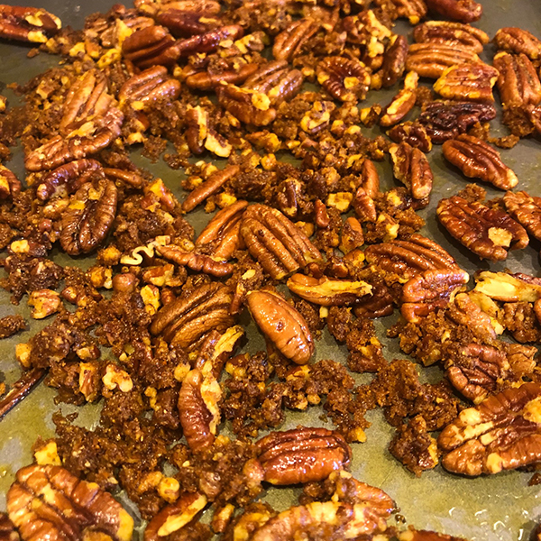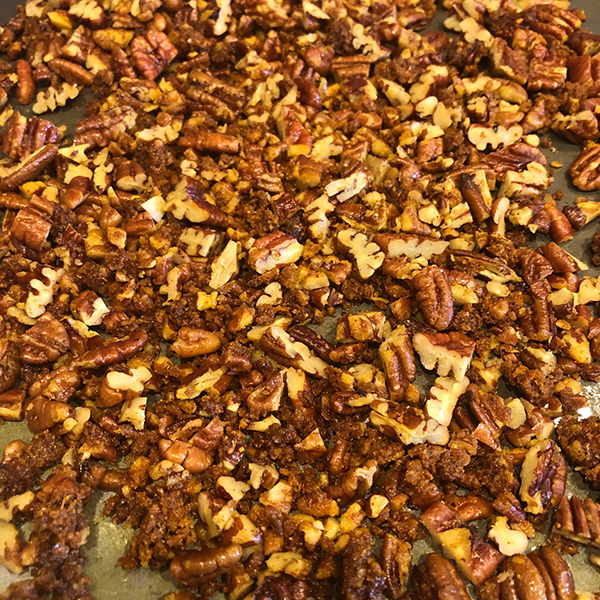 Place the canola oil in a large skillet on high heat. When the oil is very hot, add the nuts and stir constantly. Add the spice mixture one tablespoon at a time, continuing to stir until the mixture has caramelized. Pour the nuts onto a baking sheet to cool.