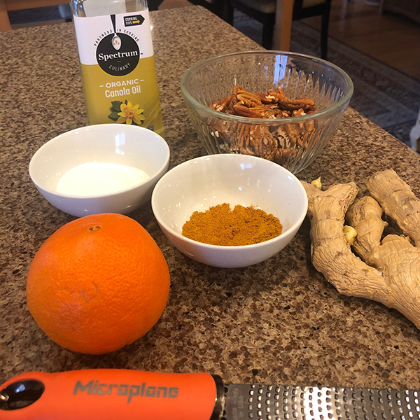 Mix the sugar, orange zest, curry powder, cayenne (if using) and gingerroot together in a small bowl and set aside.