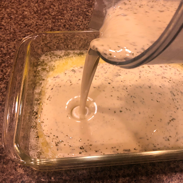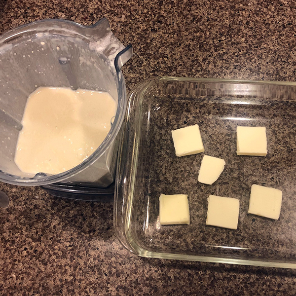 Place slices of butter in a 9×13 pan and place in the oven to melt the butter. Remove when butter is golden brown (4-5 minutes). It’s very important for the rise that the pan be very hot. Pour in the batter, return to the oven and bake for 40 minutes.