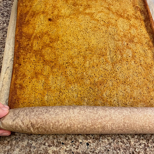 While waiting it to bake, have another piece of parchment paper ready. You’ll need this for the rolling part, to prevent the cake from sticking to itself.