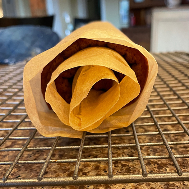 Starting on the shortest side of the rectangle, evenly roll the cake (parchment and all) into a tight roll. Once rolled, lay onto a wire rack, seam side down and let it cool to room temperature, about one hour. (You can roll from the longest side as well, if you want less of a dramatic spiral).