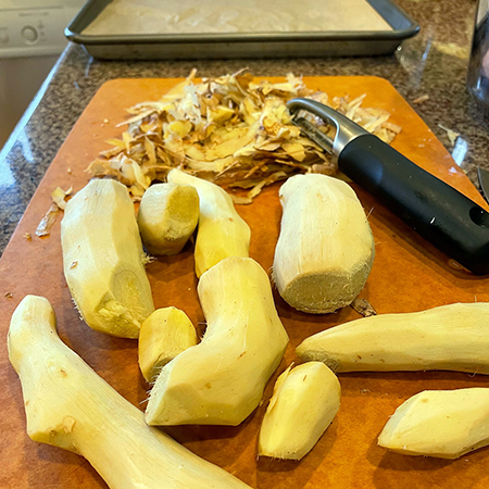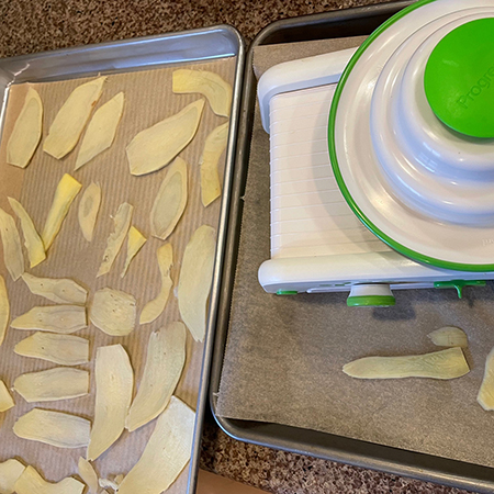 Peel the ginger and slice thinly, no more than 1/8” thick. Use a spoon to get into the knob crevasses. If you have a mandolin, this is an excellent slicing tool for this job as you get even thickness.