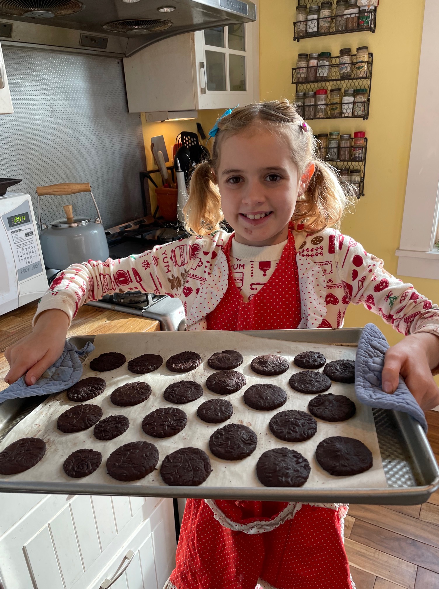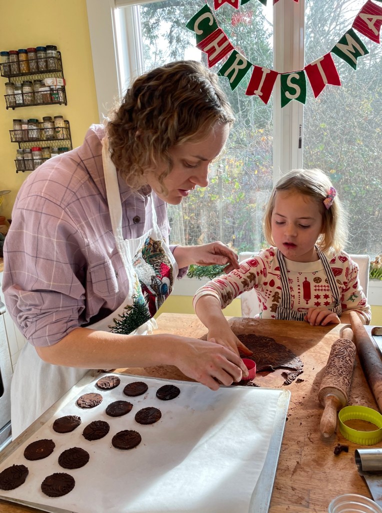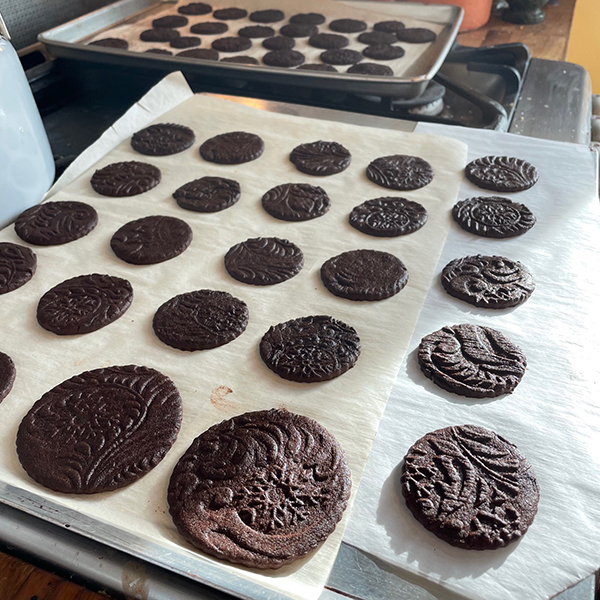 Generously dust with cocoa and pass an embossed rolling pin over the dough, thinning it to about 1/8”. Slide an offset spatula under the dough to loosen, then brush away excess cocoa and stamp into 1-1/2-inch rounds with a fluted cutter. Arrange on a parchment-lined aluminum baking sheet, leaving 1/4 inch between them. Gather scraps, knead, re-roll and cut as before. Repeat with remaining dough. Any remaining scraps can be discarded or baked to grind for crumbs.