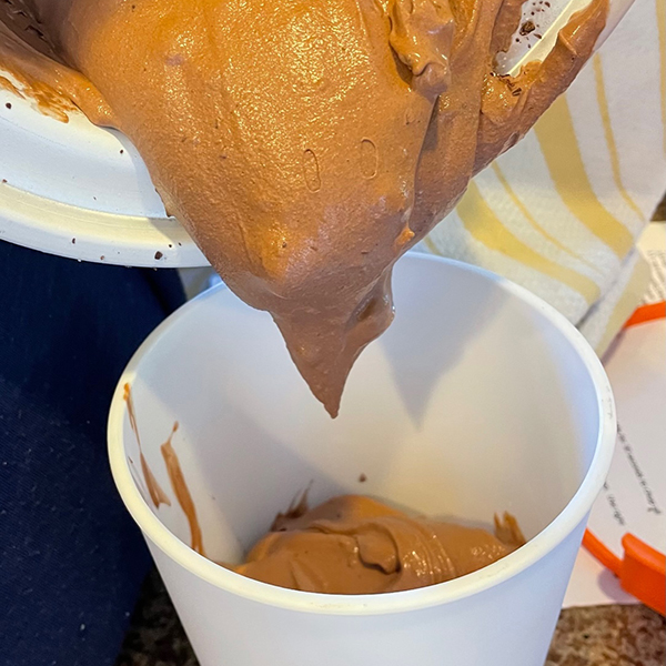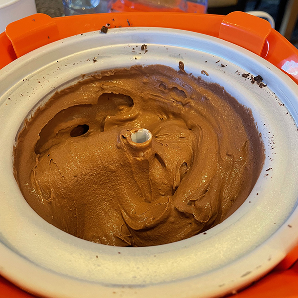 Follow the above steps, from 1 to 5, then pour the chocolate mixture into the ice cream maker. Start up the machine following the manufacturer’s instructions. It usually takes 30-40 minutes.