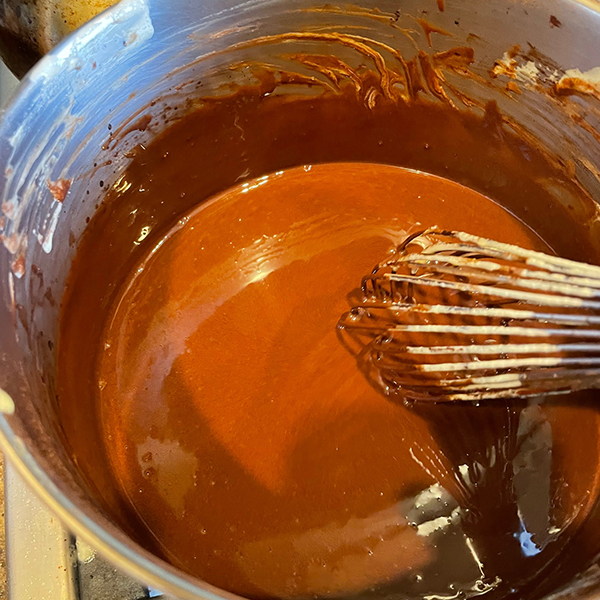 2. Continue to whisk for five minutes over very low heat. The milk must NOT boil. Chop the chocolate and add it. Let it melt completely, continuing to mix. Again, do not let it boil.