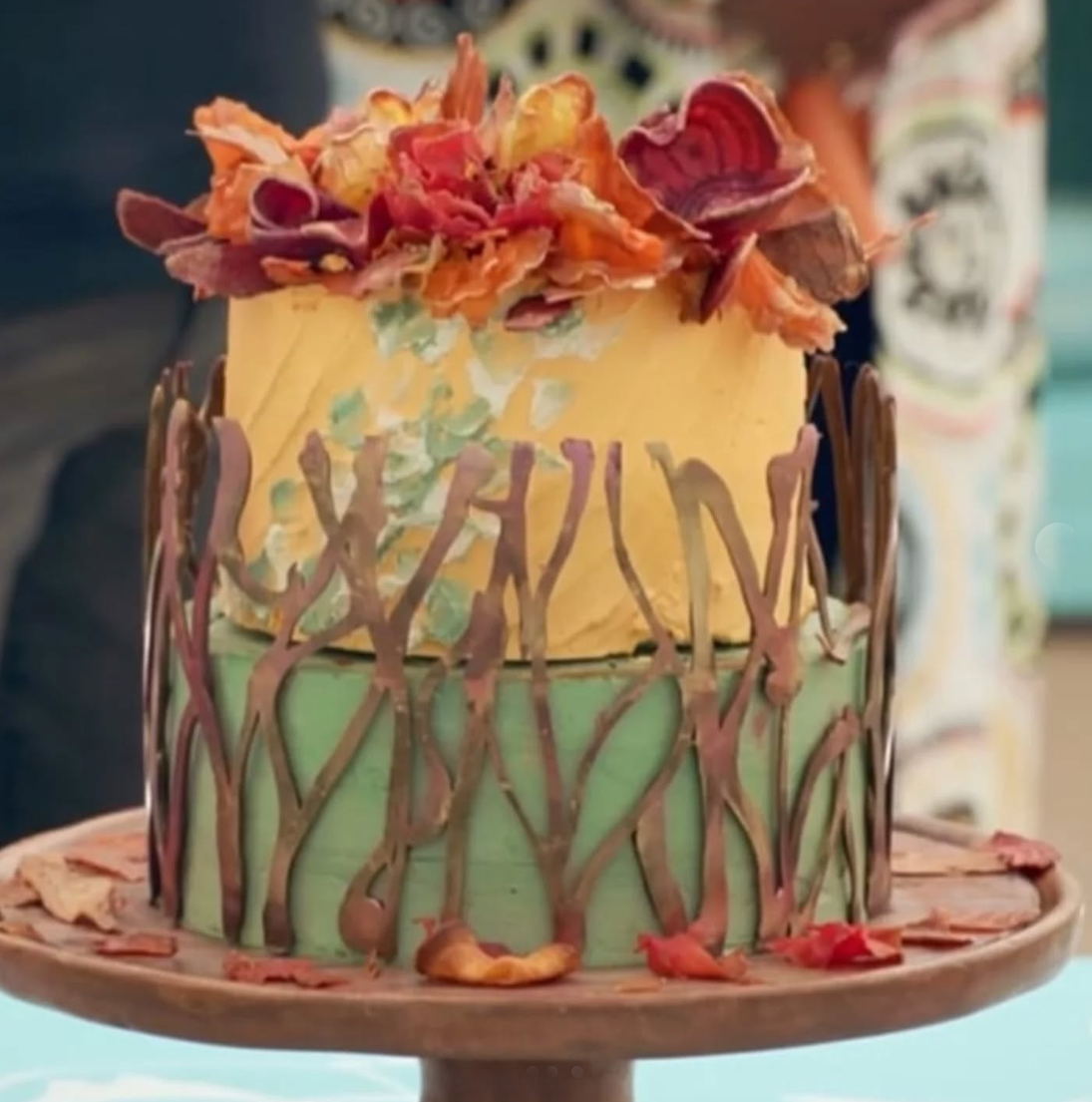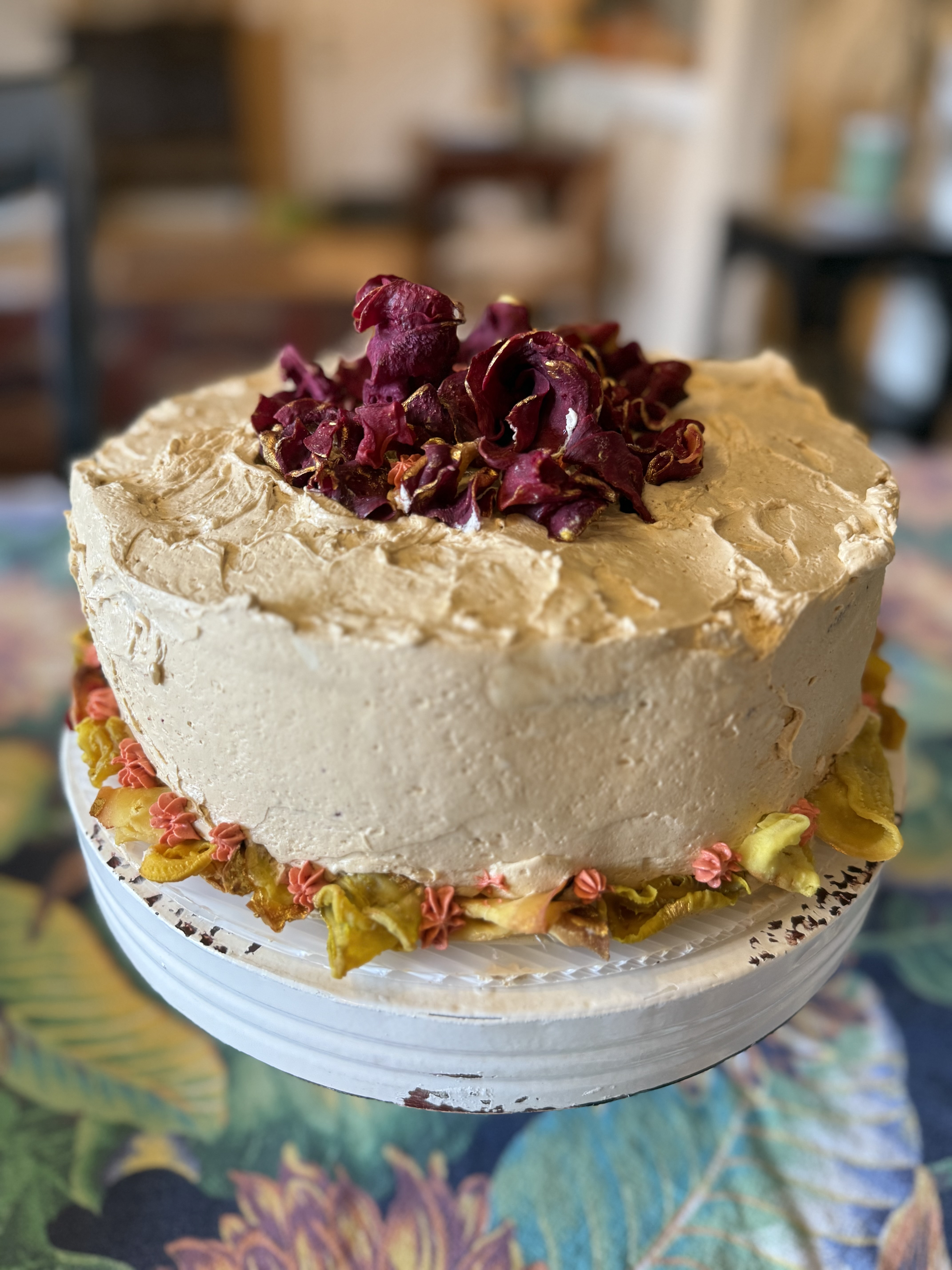 Cool and remove from tins and then spread with blackcurrant jam. Frost with Molasses Buttercream. Have fun decorating it different ways! (I used molasses for the cake on the left and Lyle’s Golden syrup for the cake on the right). You can also play with tinting your vegetable flowers with edible gold paint.