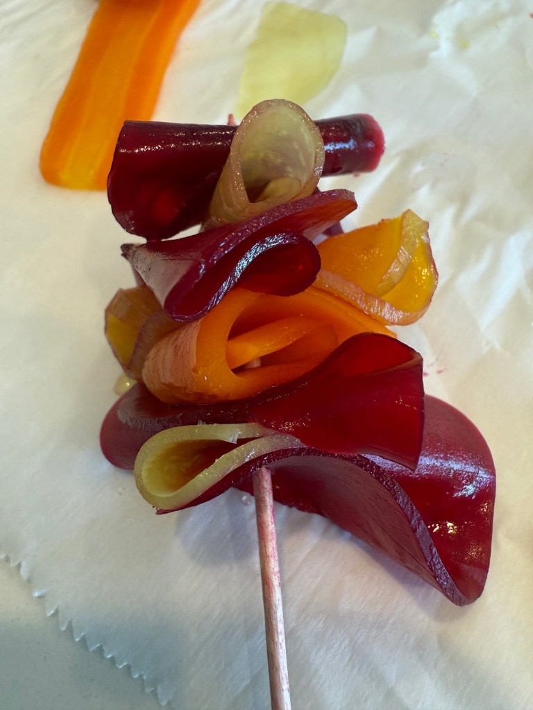 Fold the slices into petal or flower shapes and secure them with toothpicks. You can also use a greased muffin tin to hold larger flowers while they set.