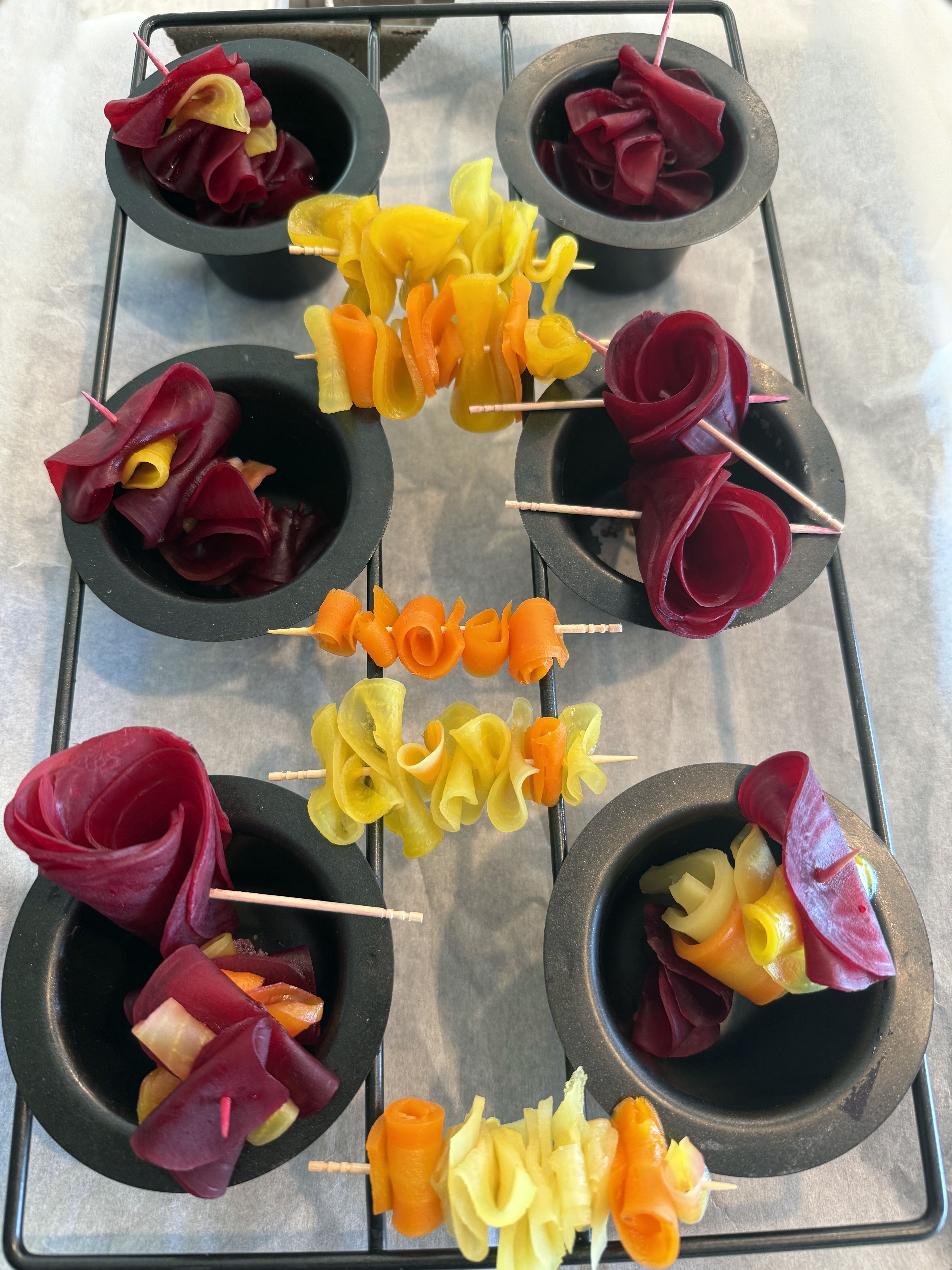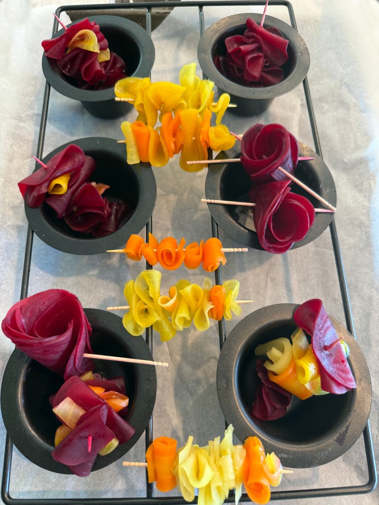 Once shaped, dehydrate the flowers. Bake 250° F for 2 hours, or until they are dry and firm. (The white parsnip flowers will need less time). They will continue to crisp up as they cool.