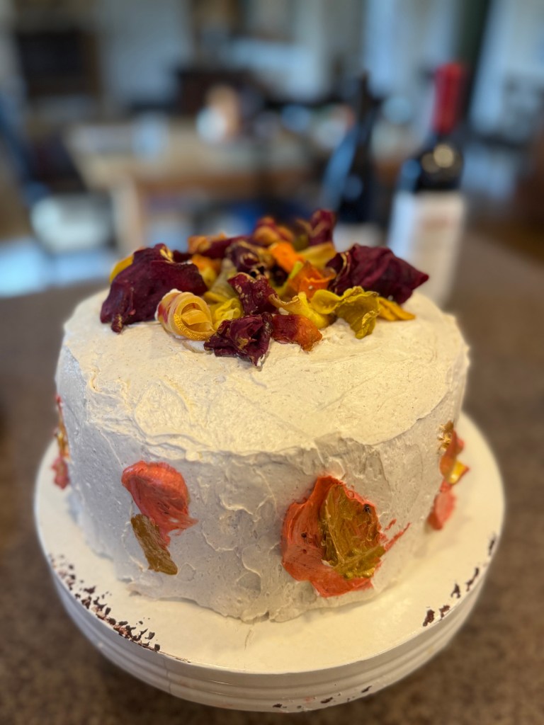 Once the flowers are dehydrated and cooled, remove the toothpicks and arrange the vegetable flowers on your frosted cake. The candied petals can be layered or clustered for a striking effect.